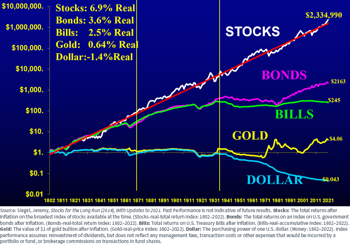 Сигел собрал данные по финансовым рынкам США начиная с 1802 года и сравнил долгосрочную доходность основных активов: